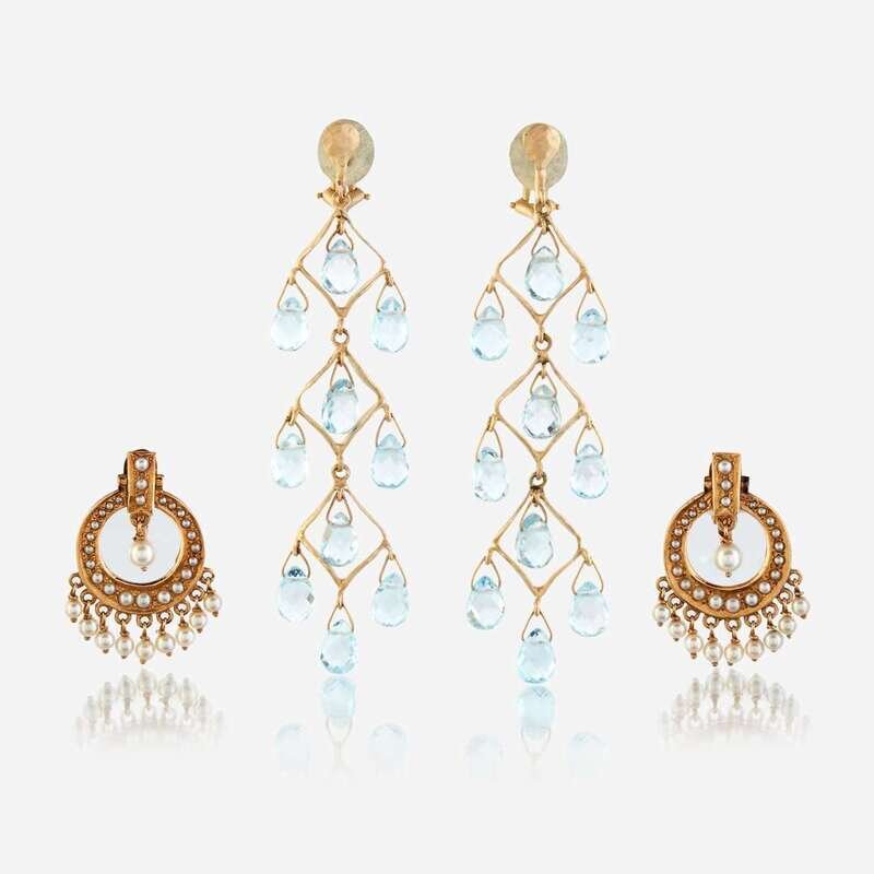Two pairs of fourteen karat gold and gem-set ear clips