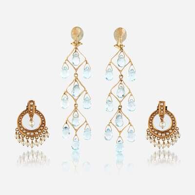 one pair designed as hammered gold suspending blue topaz briolettes measuring approximately 7.70mm x 5.50mm; the other designed as an open circle set with and suspending cultured pearls.