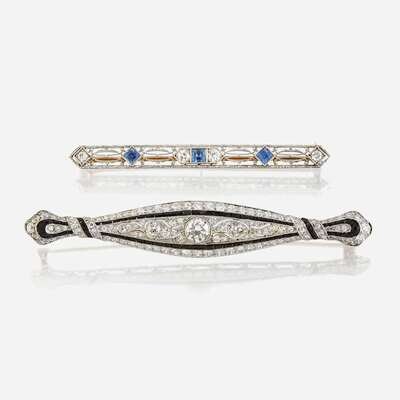 one centering an old European-cut diamond weighing appoximately 0.50 carat, accented by calibré-cut synthetic sapphires and single-cut diamonds; the other in a filigree design set with round brilliant-cut diamonds and square-cut synthetic sapphires; estimated total remaining diamond weight: 3.00 carats.
