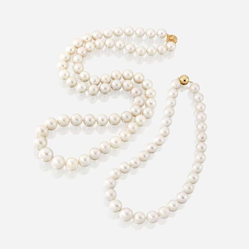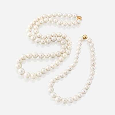 one comprised of thirty-two South Sea cultured pearls, graduating in size from 14.70 to 11.80mm, completed by fourteen karat gold ball clasp; the other comprised of sixty-three South Sea cultured pearls, graduating in size from 15.50 to 11.60mm, completed by fourteen karat gold clasp.