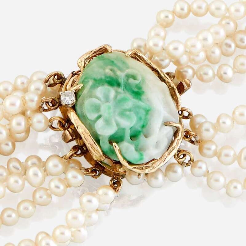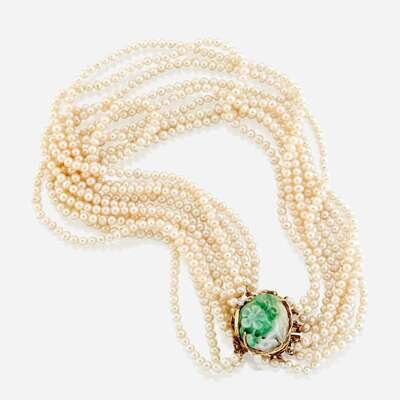 comprised of nine strands of cultured pearls measuring approximately 5.00 to 4.00mm, completed by carved jade clasp accented by a round brilliant-cut diamond, mounted in eighteen karat gold.