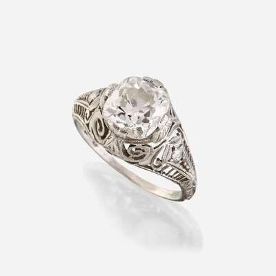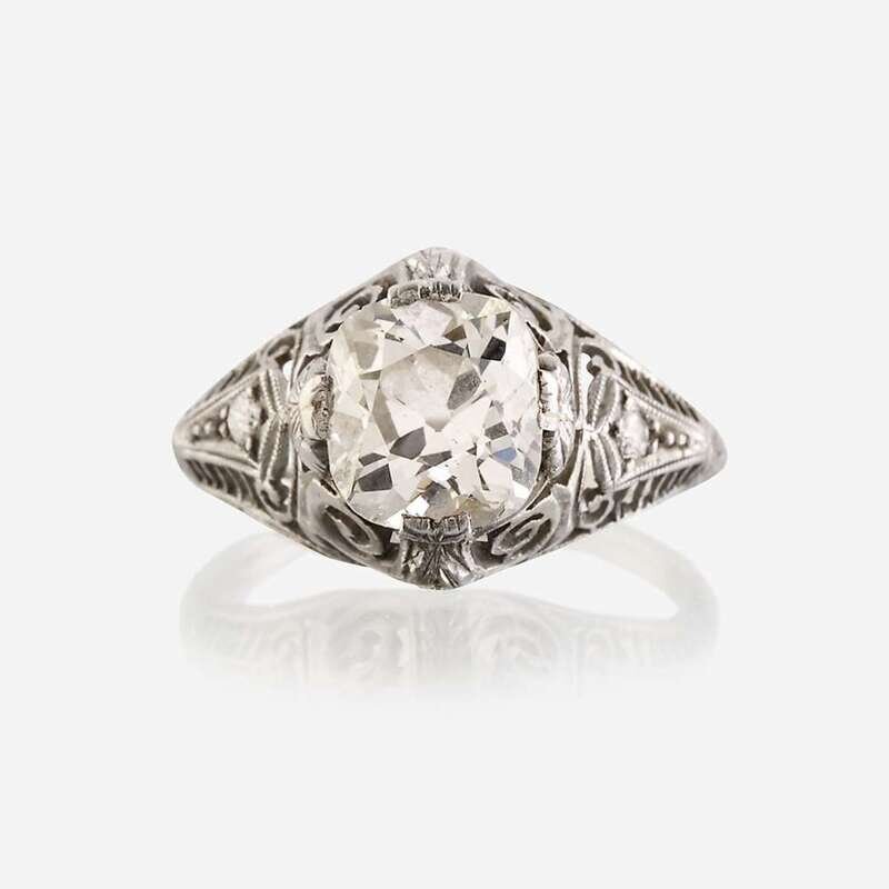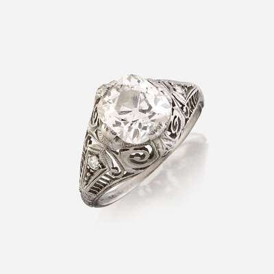 centering an old mine-cut diamond weighing approximately 2.25 carats, accented by circular-cut diamonds, mounted in pierced platinum shank.