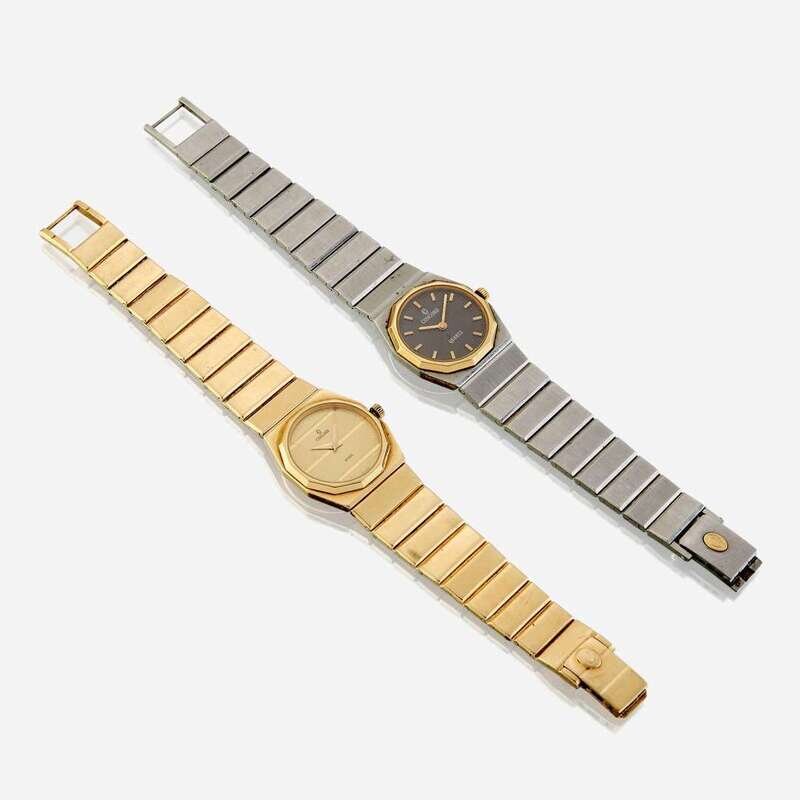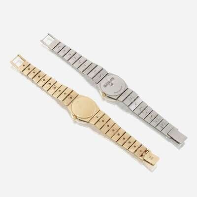 both lady's watches are Concord Mariners and quartz with geometric gold bezels and signature brick link bracelets, one in fourteen karat gold, the other in steel, with foldover clasps.