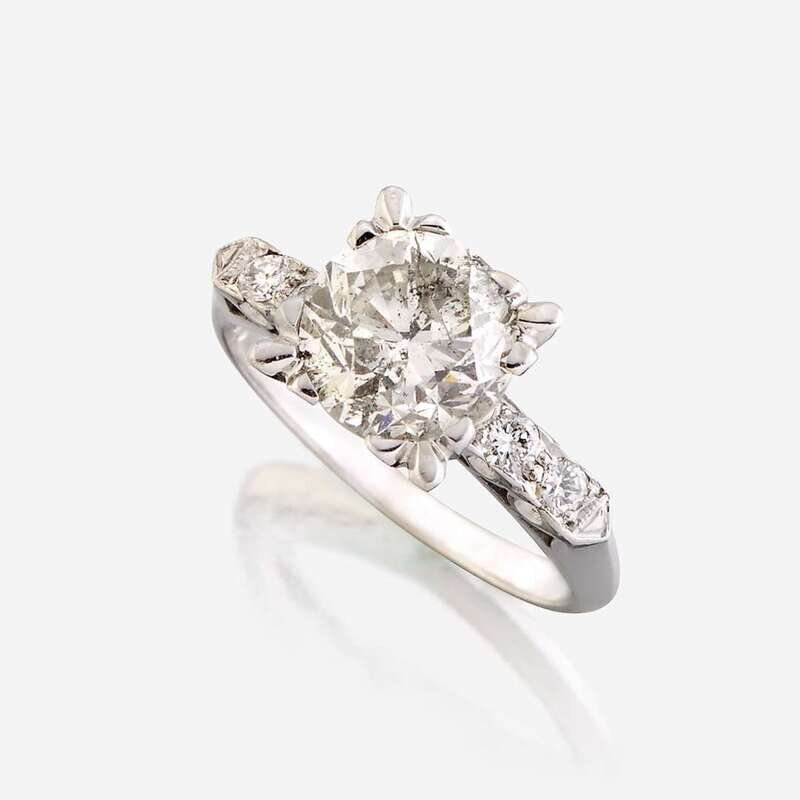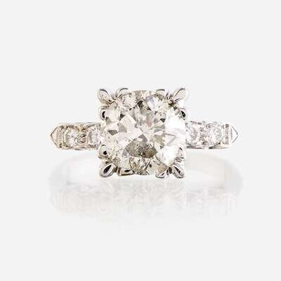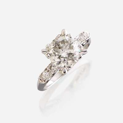 centering a round brilliant-cut diamond weighing approximately 2.25 carats, flanked by round brilliant-cut diamonds, mounted in fourteen karat white gold.