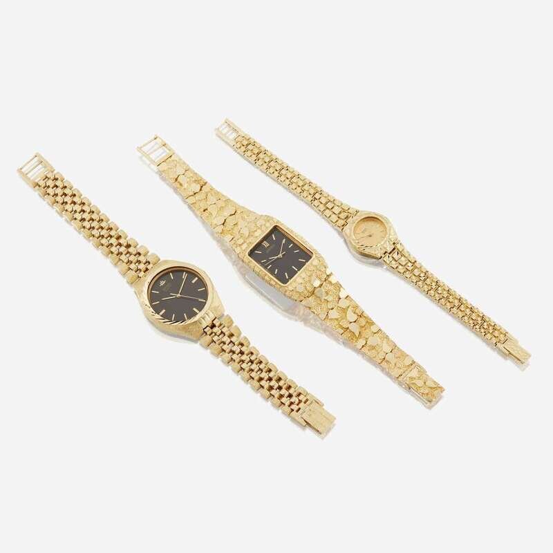 quartz movements, with attached fourteen karat gold bracelets.