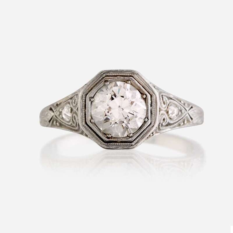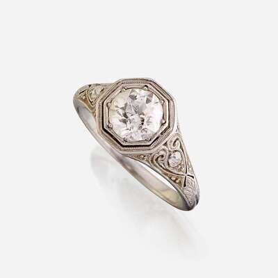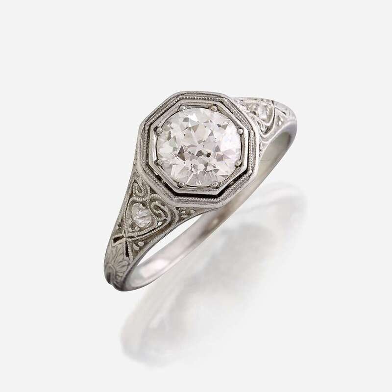 centering an old mine-cut diamond weighing approximately 1.00 carat, flanked by old mine-cut diamonds, mounted in pierced platinum.