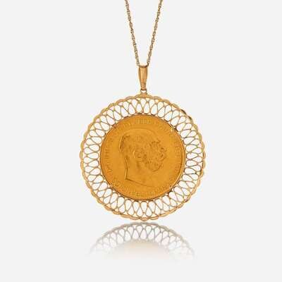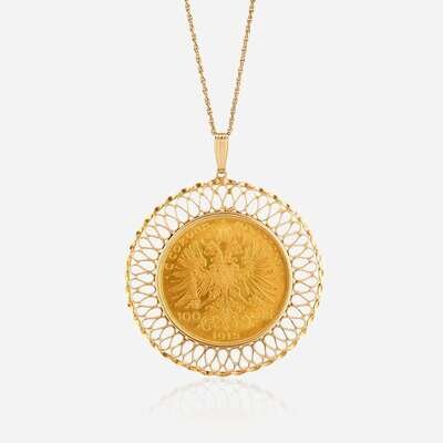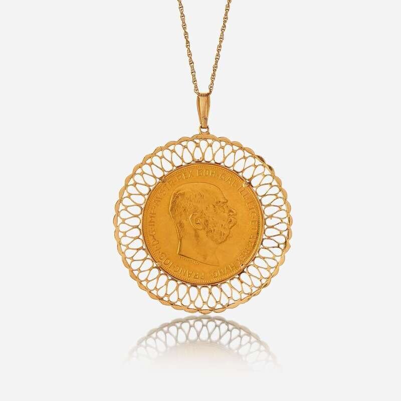 centering an eighteen karat gold 1915 Austro-Hungarian 100 Corona, set in fourteen karat gold frame.