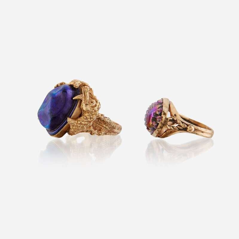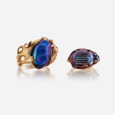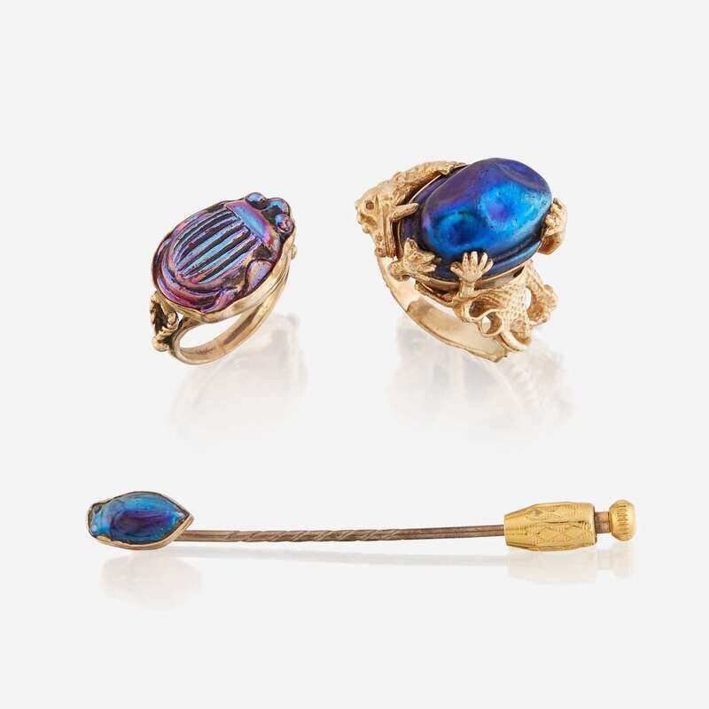 including a two rings and a stick pin set with favrile glass attributed to Tiffany Studios.