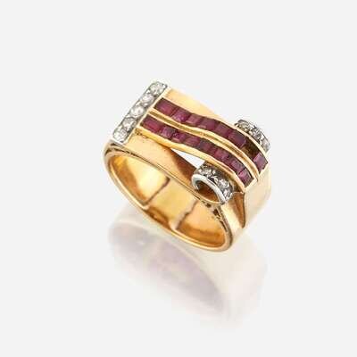 A Retro ruby, diamond, eighteen karat gold, and platinum ring