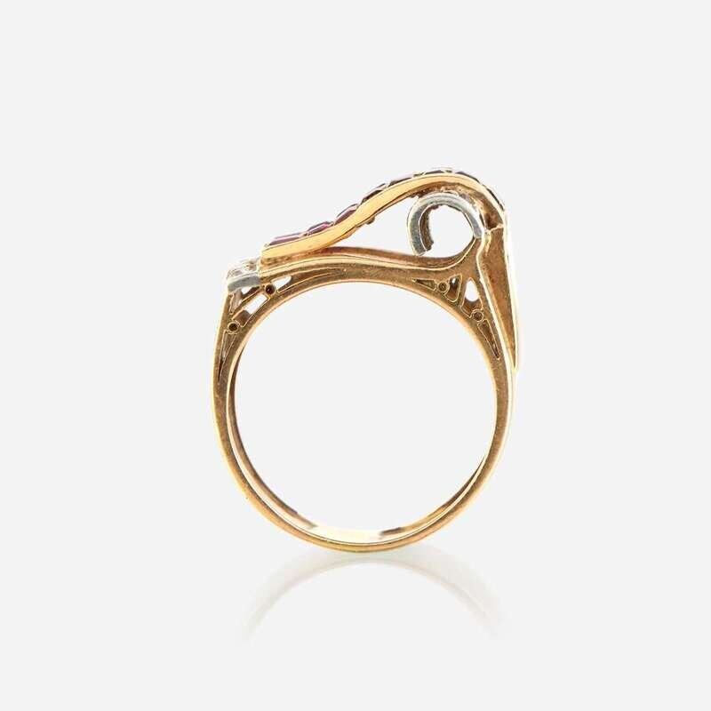 set with channel-set rubies and single-cut diamonds in a scroll motif.