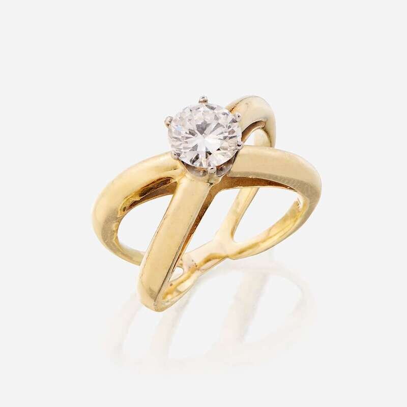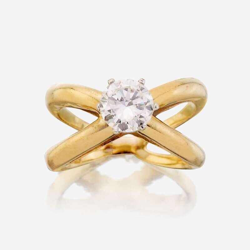 centering an old European-cut diamond weighing approximately 1.50 carats, mounted in eighteen karat gold crossover shank.