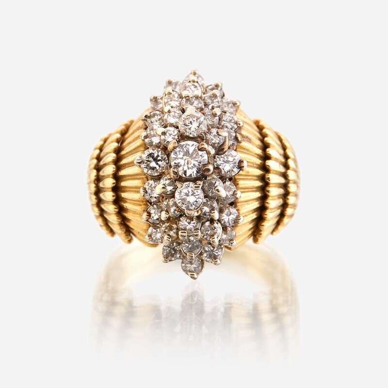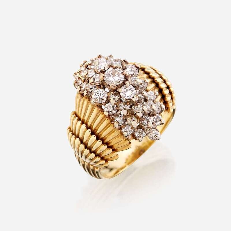 set to the top with round brilliant-cut diamonds, flanked by cascading fluted shank; estimated total diamond weight: 1.75 carats.