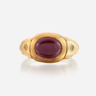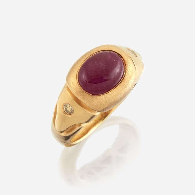centering a cabochon ruby weighing approximately 3.25 carats, flanked by round brilliant-cut yellow diamonds (not tested for origin or nature of color), within a matte and polished finish twenty-two karat gold setting.