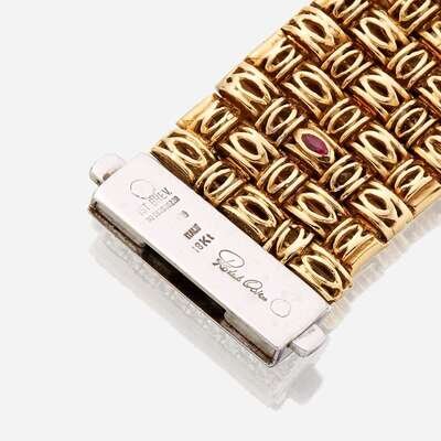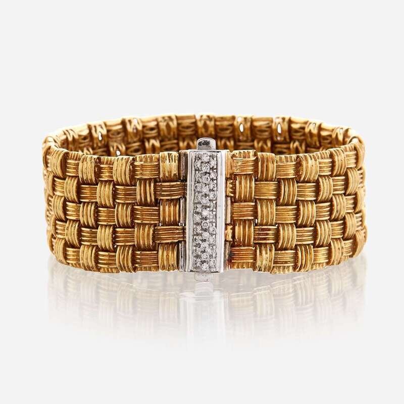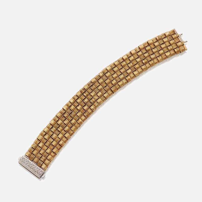 designed as a highly flexible strap bracelet with woven links, completed by white gold clasp set with round brilliant-cut diamonds.