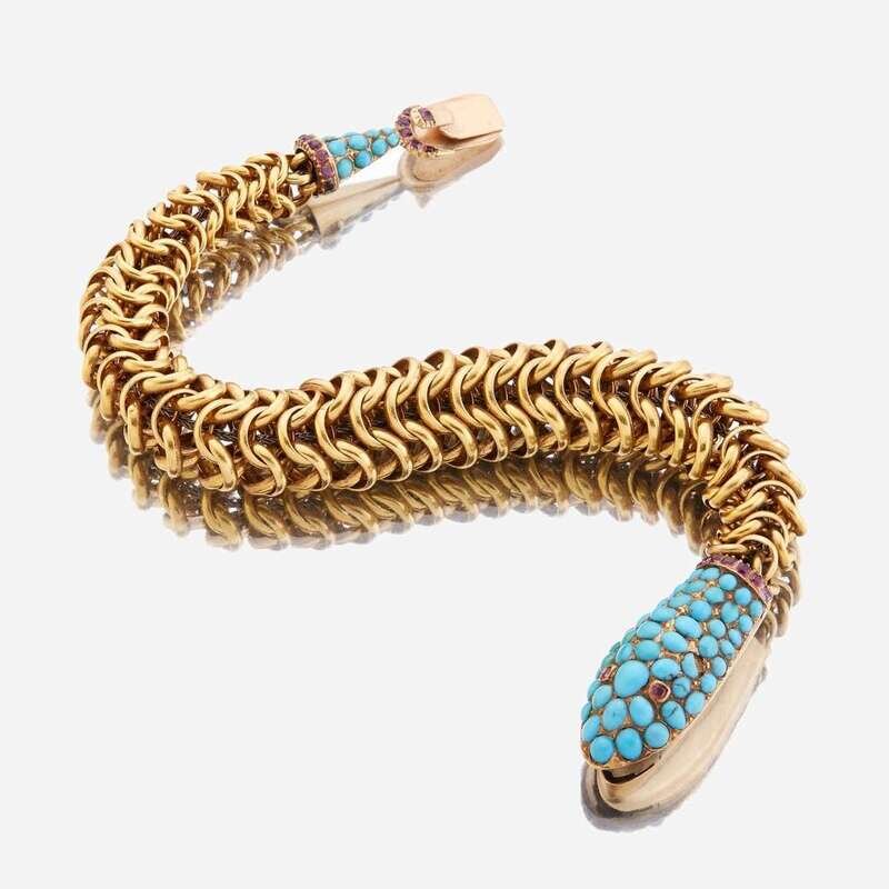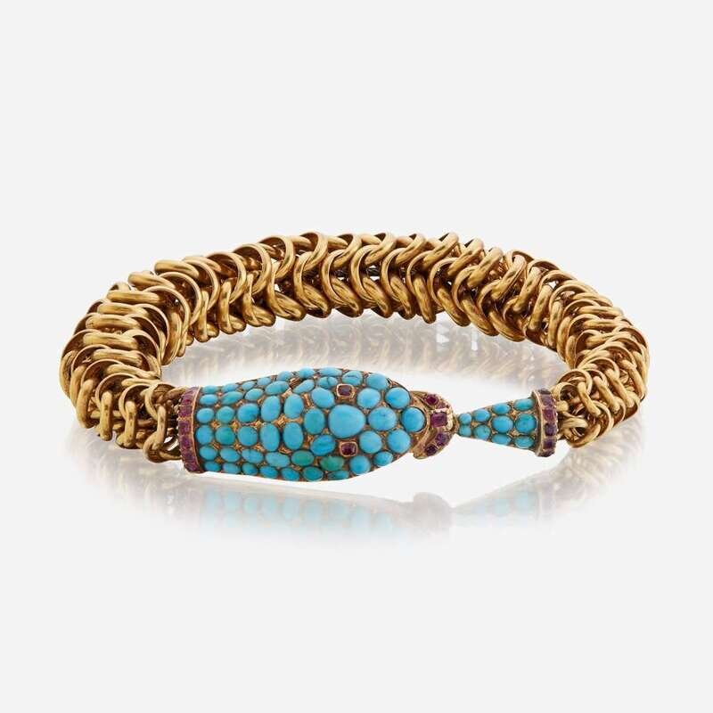designed as a highly flexible snake, the head and tail mounted with cabochon turquoise and faceted rubies.