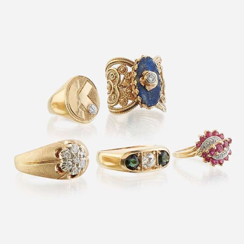 one designed as a fourteen karat gold signet stamped "K" accented by a round brilliant-cut diamond; one centering a cluster of round brilliant-cut diamonds in textured fourteen karat gold mounting; one wide fourteen karat gold filigree band centering a lapis lazuli tablet, bezel-set with a round brilliant-cut diamond; one centering an old European-cut diamond flanked by circular-cut green sapphires in fourteen karat gold mount; and one centering a circular-cut ruby and round brilliant-cut diamond cluster, mounted in ten karat gold.