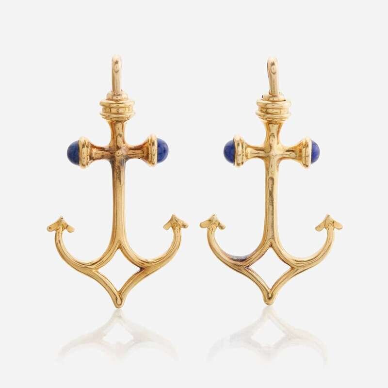 both designed as anchors accented by lapis lazuli cabochons measuring approximately 6.30mm in diameter.