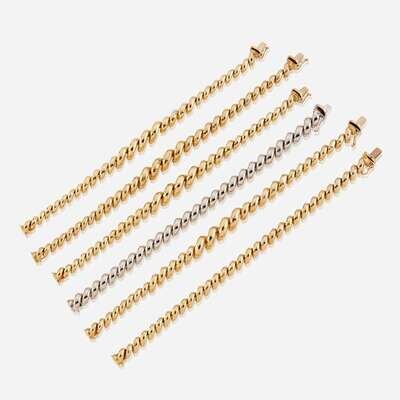 A collection of six fourteen karat gold bracelets