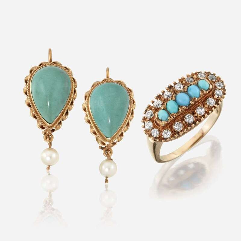 the ring centering five oval cabochon turquoise, surrounded by old mine-cut diamonds; the earrings designed as pear shaped cabochon turquoise measuring approximately 14.10 x 9.40 x 6.00mm, each suspending a cultured pearl measuring 4.30mm.