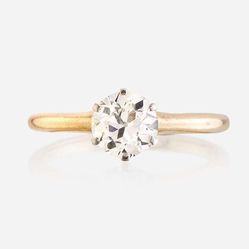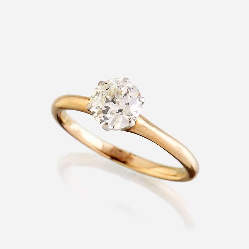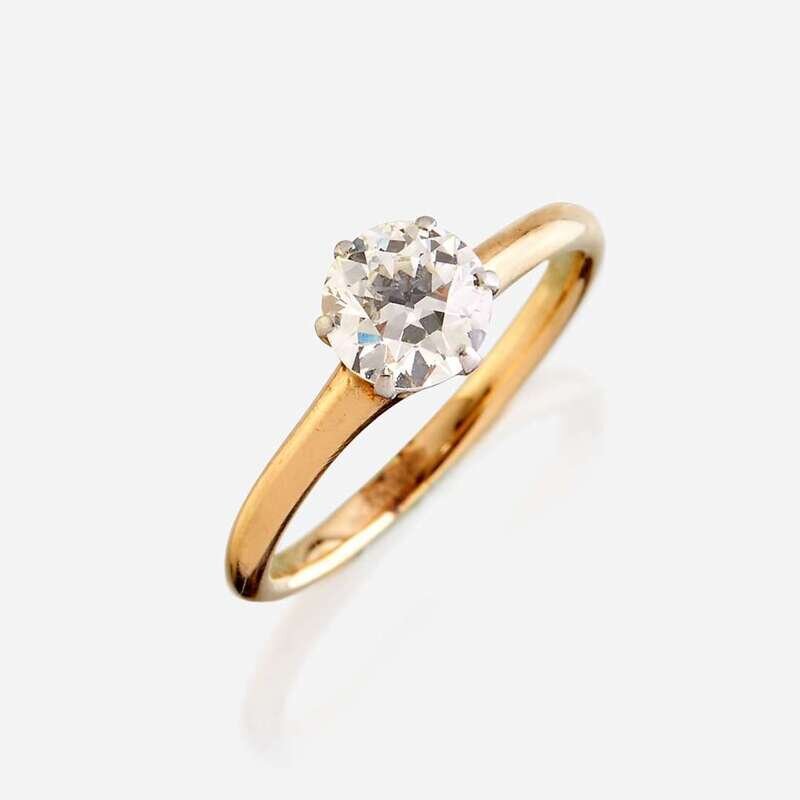 centering an old European-cut diamond weighing approximately 0.80 carats, mounted in fourteen karat gold.