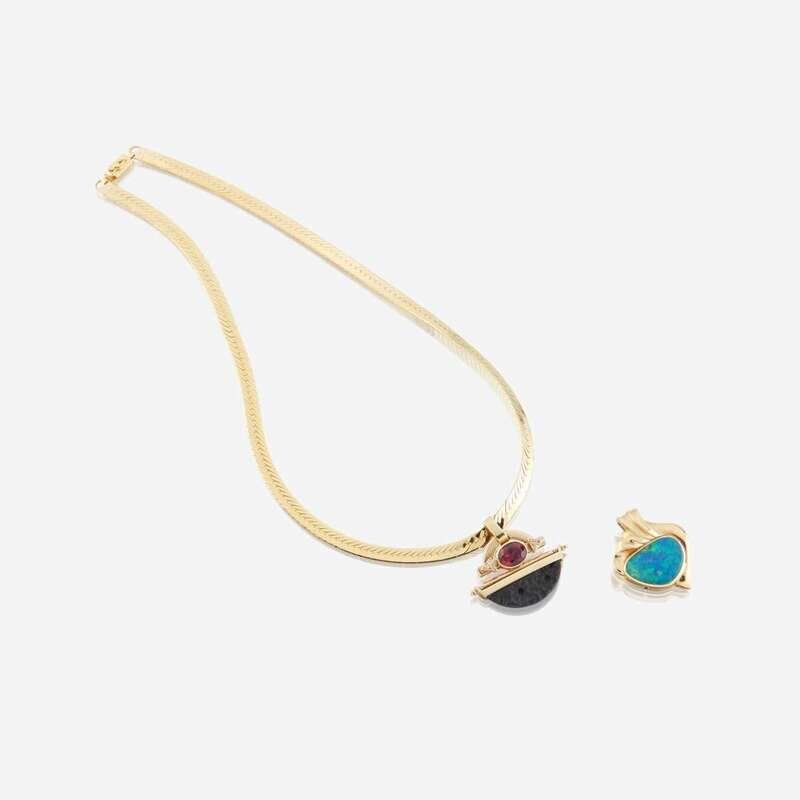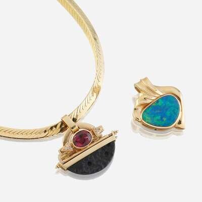 Two fourteen karat gold and gem-set enhancers with necklace