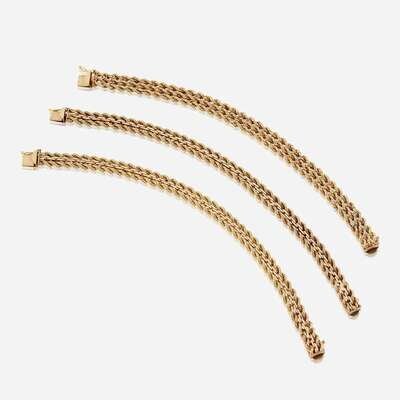 two designed as twisted rope edges around a box link; one designed as three strands of twisted rope.