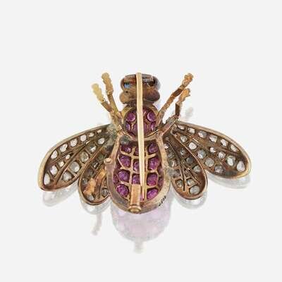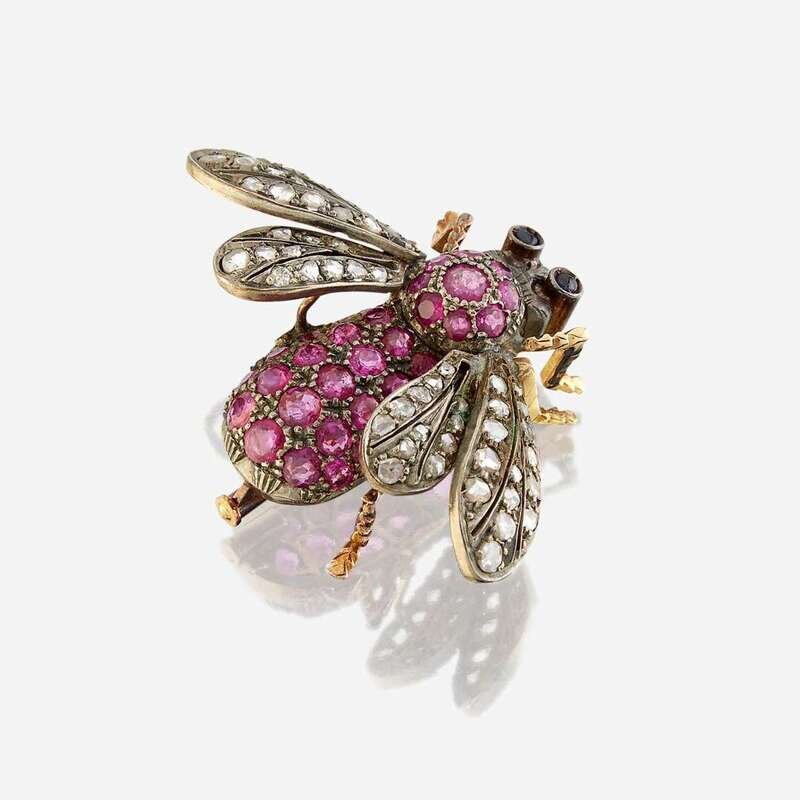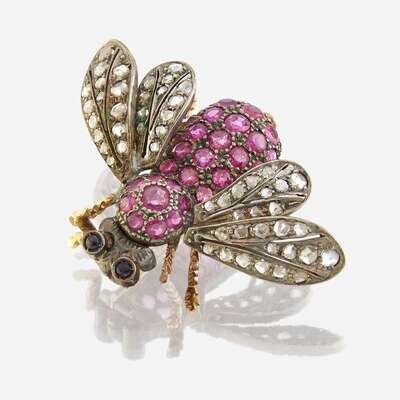 the bee motif set with circular-cut rubies, wings set with rose-cut diamonds, and eyes set as cabochon sapphires.