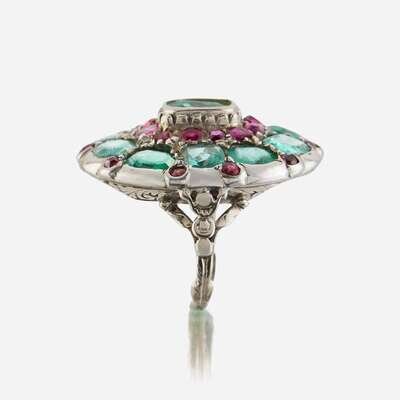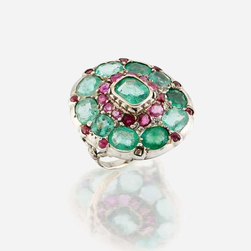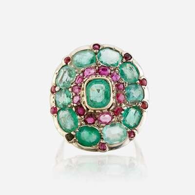 set throughout with oval-cut green beryl and circular-cut rubies in scalloped setting.