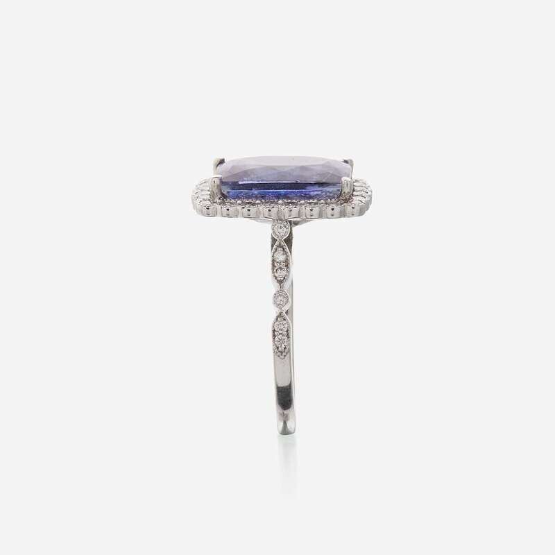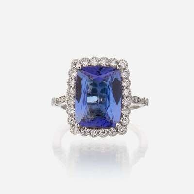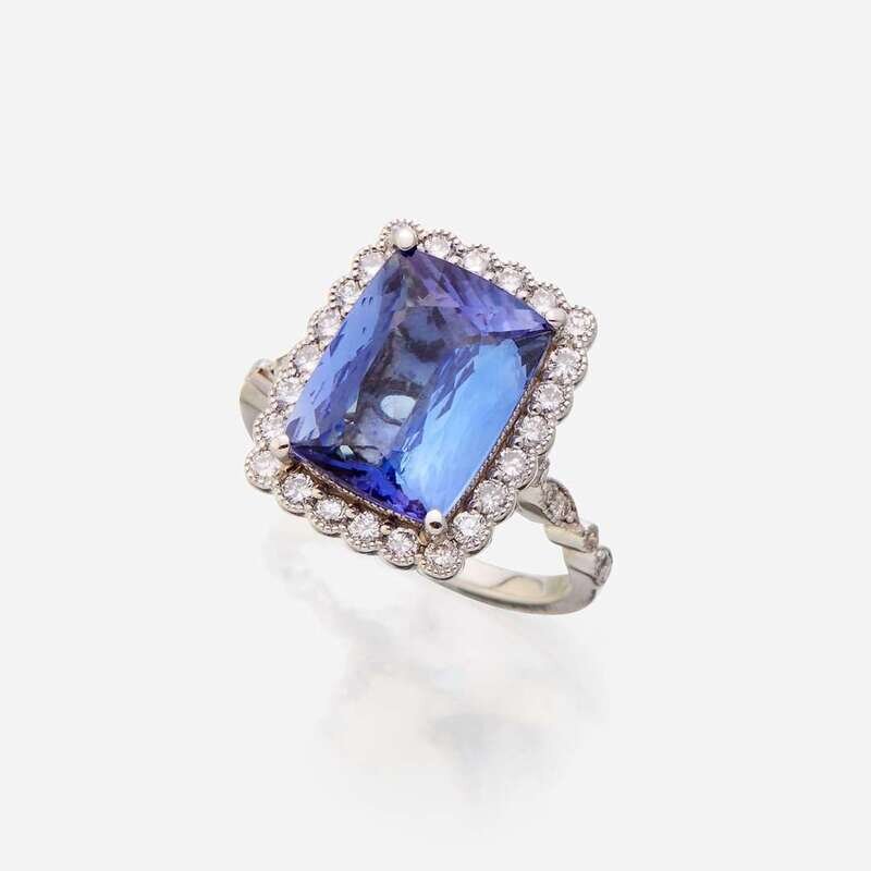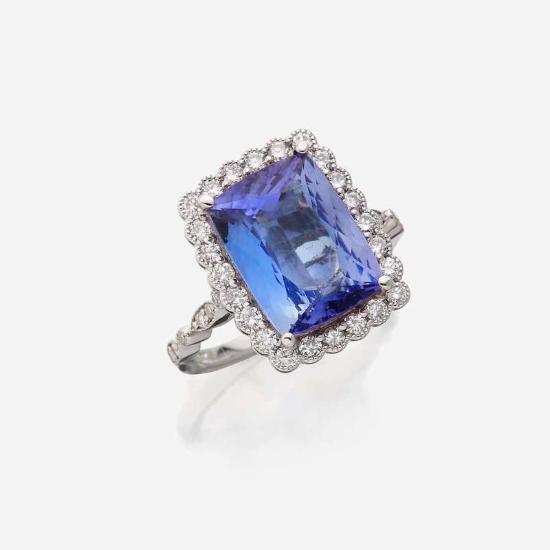 A tanzanite, diamond, and eighteen karat white gold ring