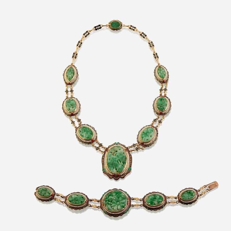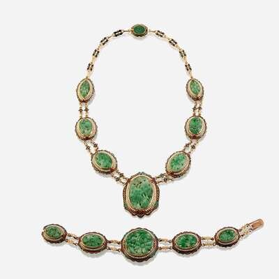 both the necklace and bracelet comprised of links set with carved jadeite jade tablets, surrounded by seed pearls, accented throughout with black, green, and red enamel.