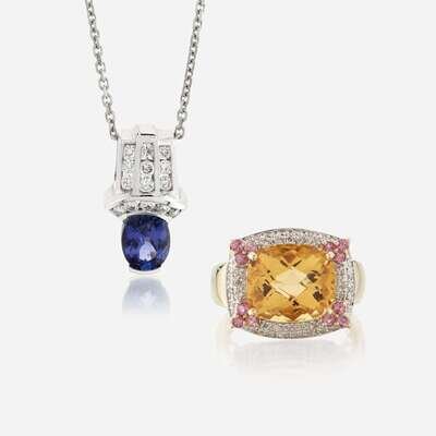 the ring centering a faceted cushion-cut citrine weighing approximately 5.25 carats, surrounded by circular-cut diamonds and pink sapphires; the pendant centering an oval-cut tanzanite weighing approximately 1.00 carat, accented by round brilliant-cut diamonds.