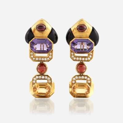 each set with an clipped corner emerald-cut amethyst and citrine, accented by cabochon garnets, onyx accents, and circular-cut diamonds.