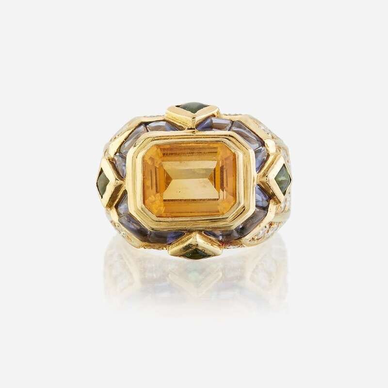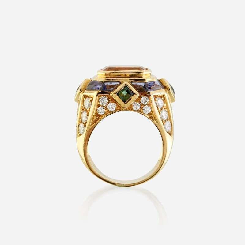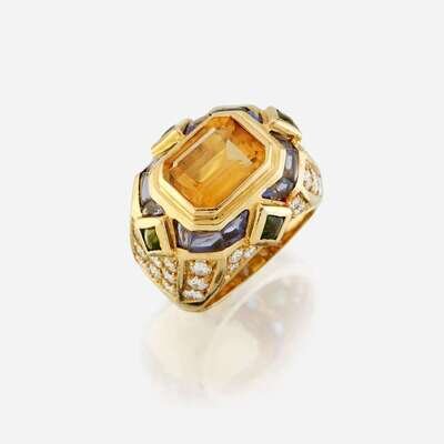 A citrine, diamond, sapphire, peridot, and eighteen karat gold ring