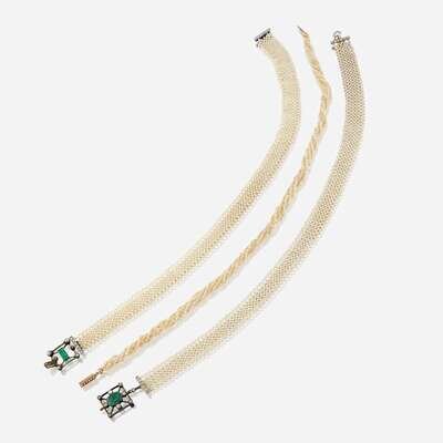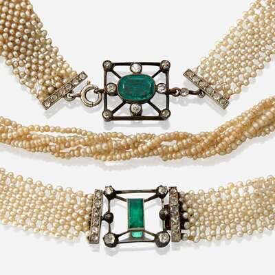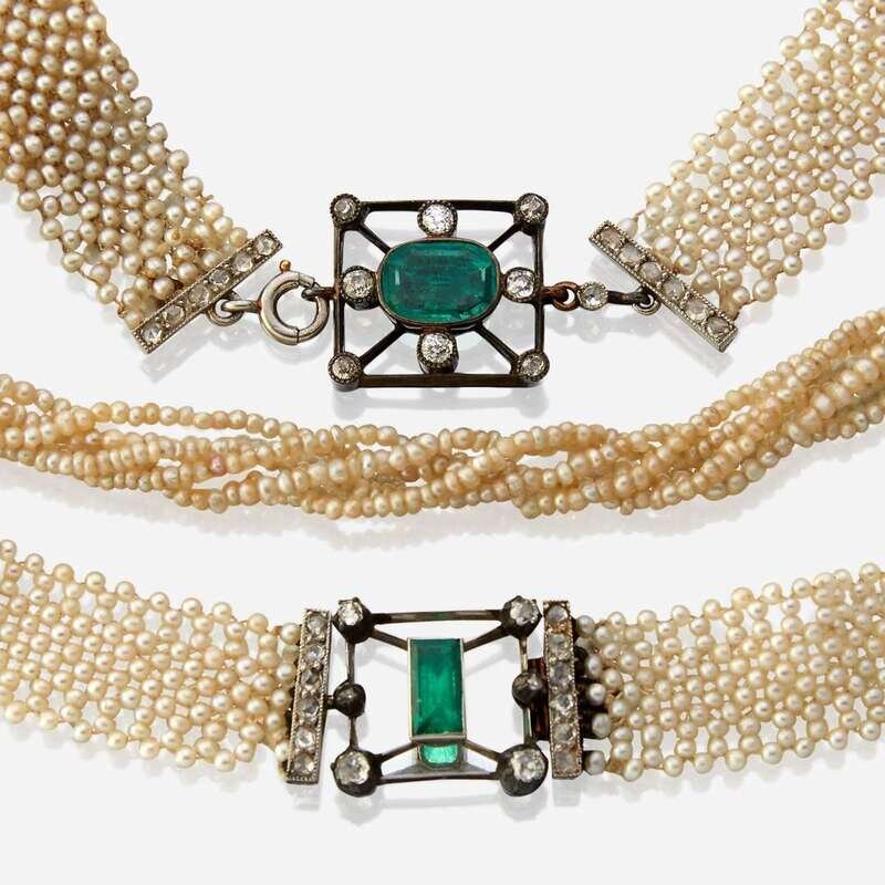 two necklaces comprised of seed pearl weave with platinum end pieces set with rose-cut diamonds, with green beryl and diamond set silver clasps; the other a seed pearl torsade with low karat gold clasp.