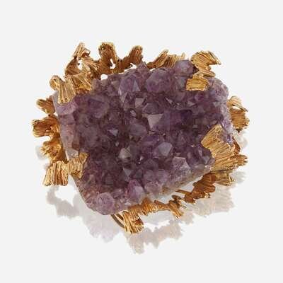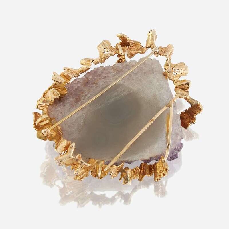 An amethyst geode and fourteen karat gold pendant/brooch
