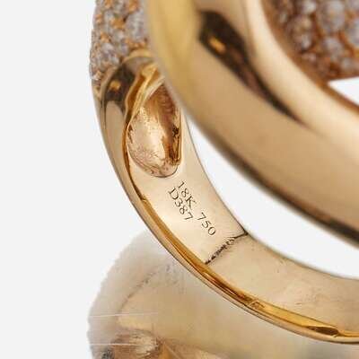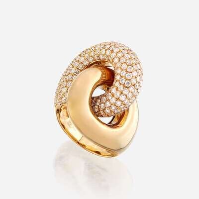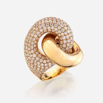 designed as a knot bypass accented by pavé-set round brilliant-cut diamonds; estimated total diamond weight: 3.80 carats.