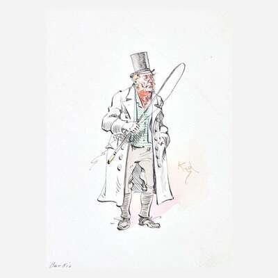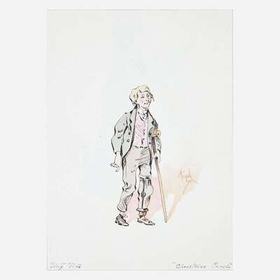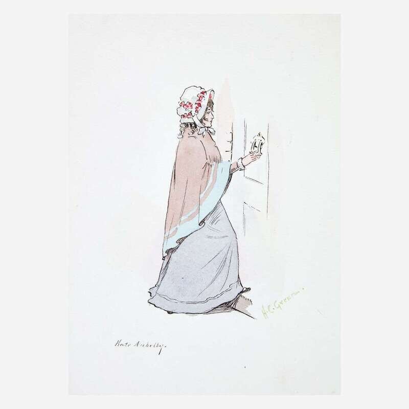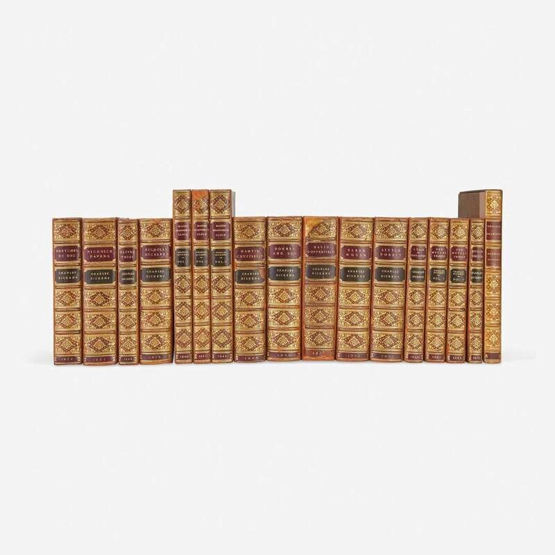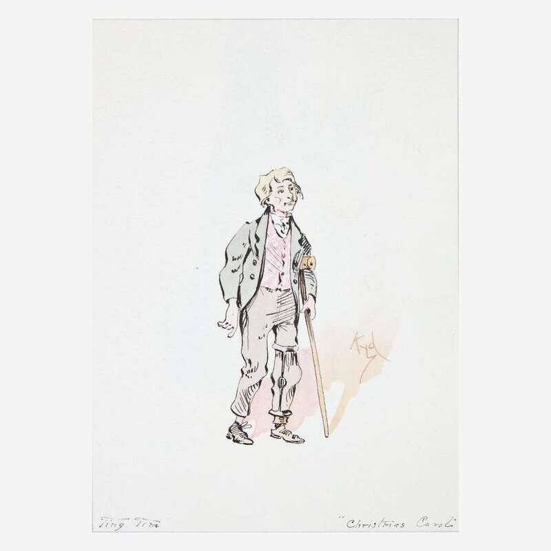 Lot includes a collection of 56 original watercolor illustrations of characters from many Dickens novels, by "Kyd" (Joseph Clark Clayton), H.C. Green, and others; in quarter calf folding case. Lot also includes annotated and bound auction catalogue from the sale below.