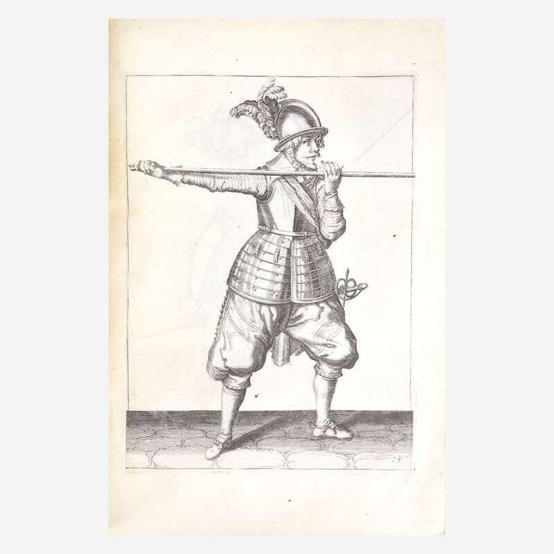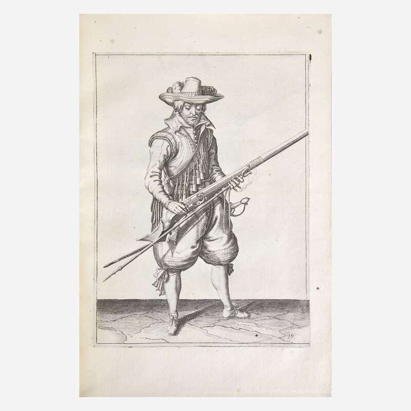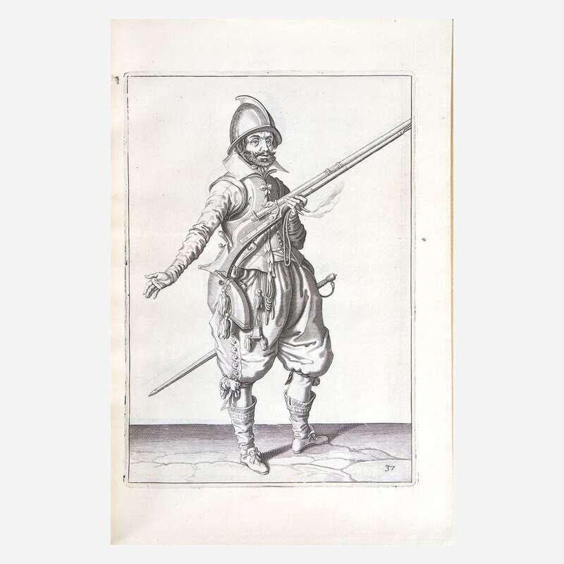 Jacob de Gheyn's celebrated work on the use of arms, featuring 42 engraved plates on the use of the arquebuss, 43 engraved plates on the use of the musket, and 32 engraved plates on the use of the pike. The first edition appeared in English in 1607. "These plates were reissued in 1608 with letterpress in French, in Danish, and in German..." (Cockle 79).