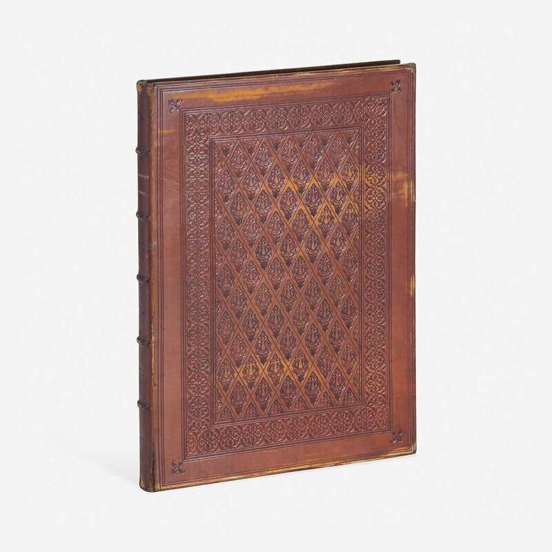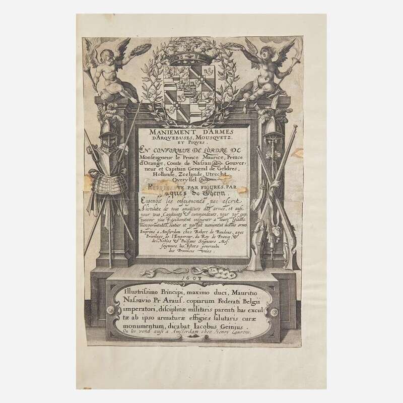Amsterdam: Robert de Baudous, sold by Henry Laurens, 1608 (altered in plate from 1607 to 1608). Three parts in one volume. First edition in French. Small folio. (v), 42 pl.; (iv), 43 pl.; (4), 32 pl. Illustrated with engraved vignette title-page and 117 engraved plates. Early 20th-century full brown calf, elaborately stamped in blind, spine lettered in gilt, front and rear boards rubbed, front and rear joints rubbed, bottom front joint split, foot of spine chipped; all edges gilt; by Ch. Weill, Orléans; title-page trimmed, laid down, and with losses filled-in in MS.; most text and plate leaves repaired along edges; five-inch open tear in middle of text of "Le mousquet" leaf, but with no loss; five-inch repaired closed tear traversing bottom of plate 29 in third part; in quarter calf slip case. Riling 69; Lipperheide 2058; Cockle 79