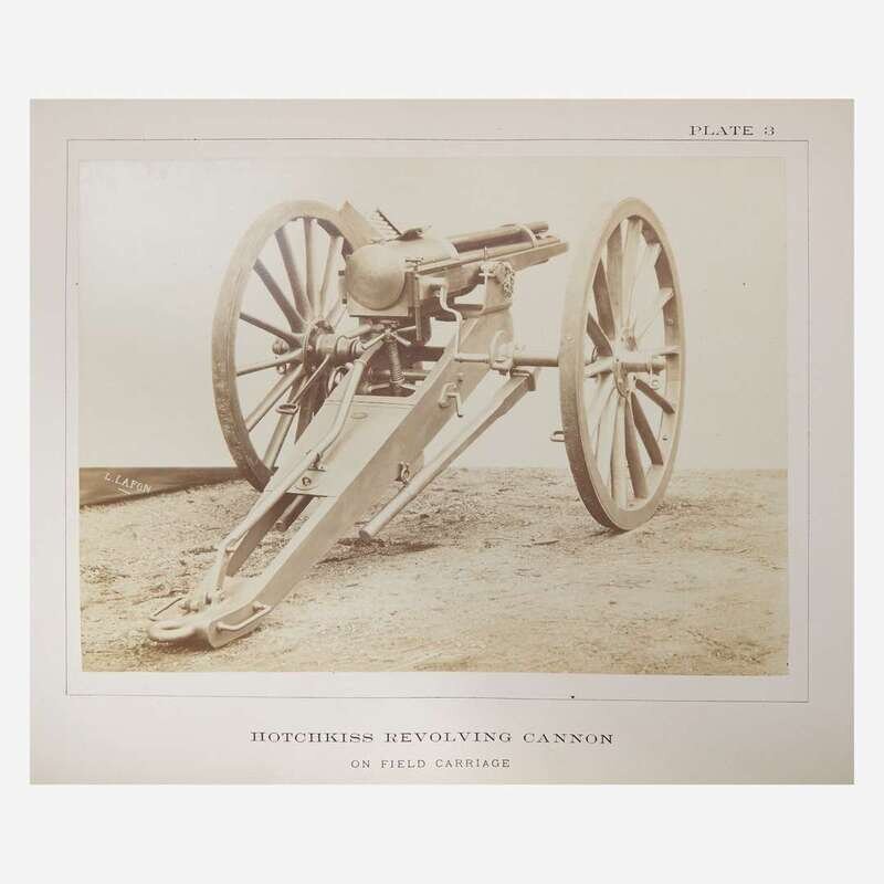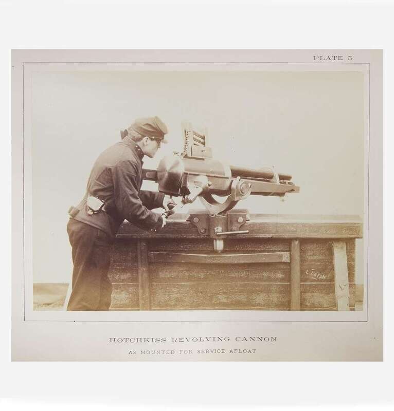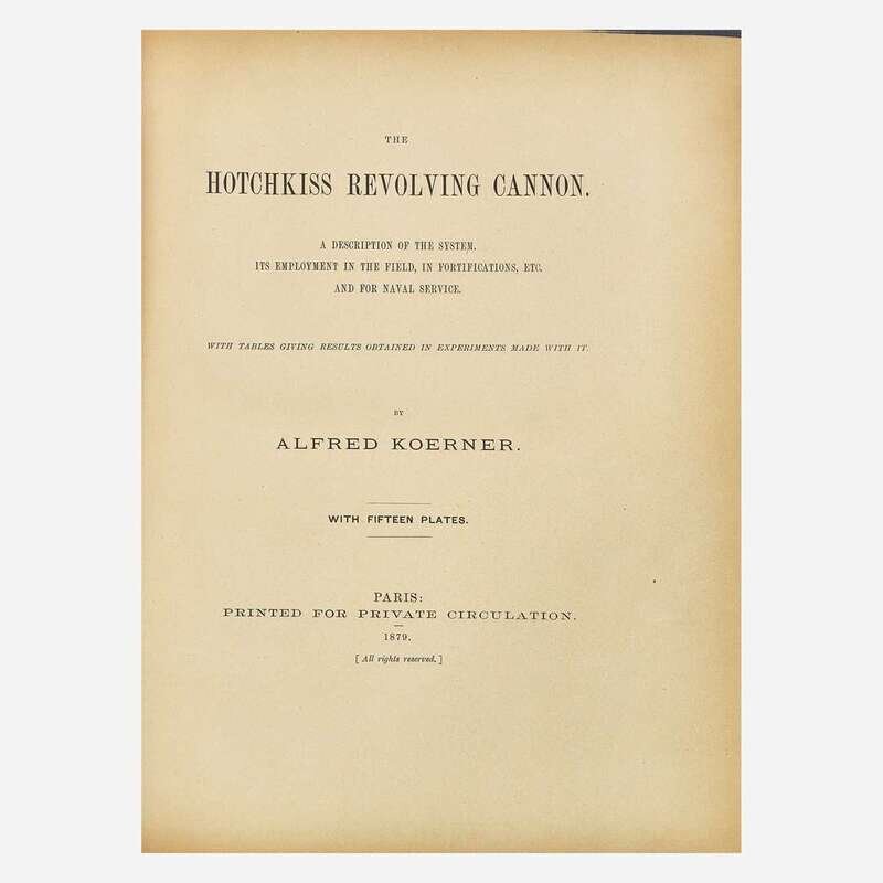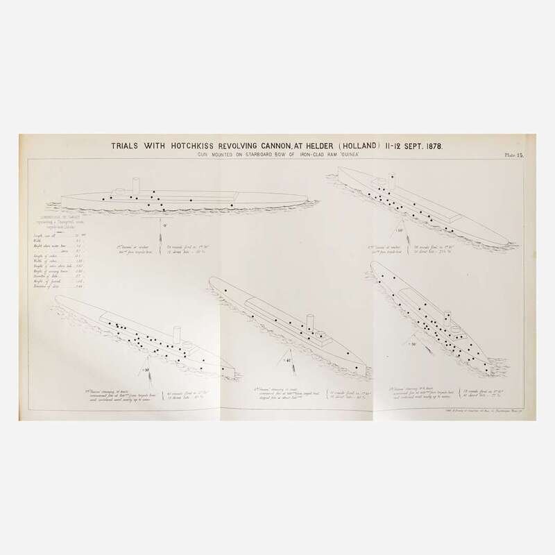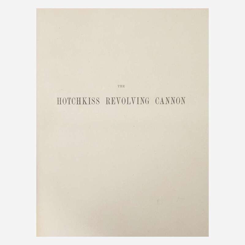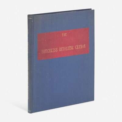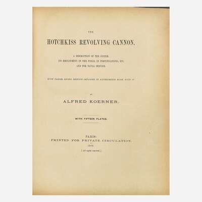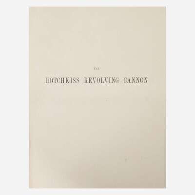 A rare trade catalogue for the Hotchkiss Revolving Cannon, an early type of machine gun, invented by Hotchkiss & Co. founder, Benjamin B. Hotchkiss in 1872. This catalogue details the Cannon's various components and construction, its six different calibers and ballistic capabilities, as well as its on-the-field tactical uses. The various calibers of the gun (37-53 mm) allowed it to be used in a variety of military settings, such as a light mobile version to use on the field to serve as auxiliary to cavalry and troop units, and more powerful mounted versions to serve on naval ships to pierce ironclad vessels. The photographs in the rear of this volume depict the cannon's various uses, showing unmounted and mounted versions and their different ammunition, while the numerous lithographic charts show its accuracy and power, measured in tests performed at the Coast Guard base at Sandy Hook, New Jersey.