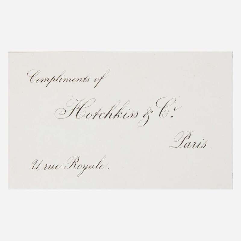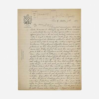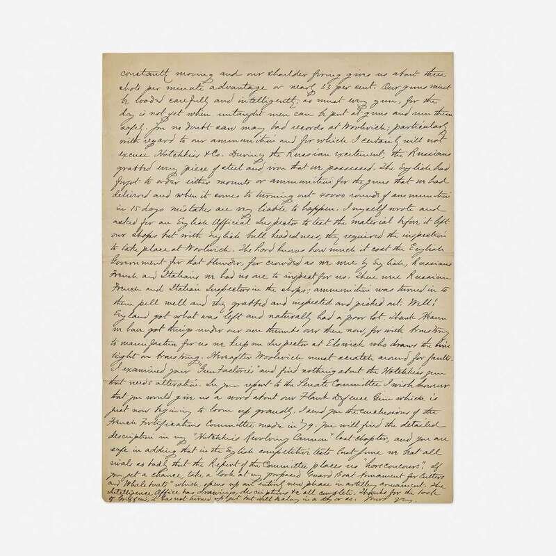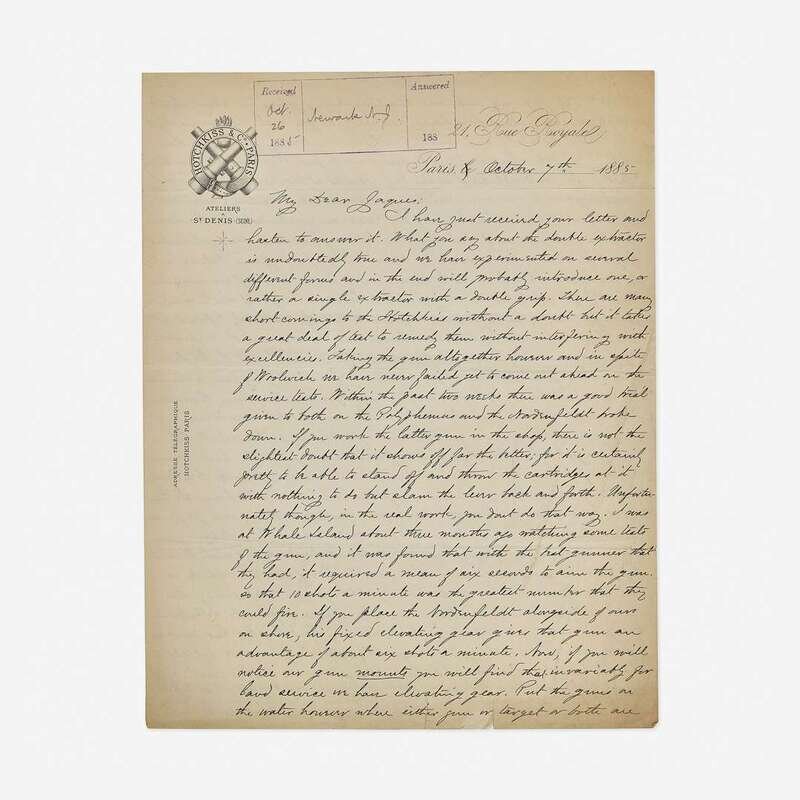 Includes an autograph letter, signed by American Lieutenant Edward Wilson Very (1847-1910), while serving as a representative for the French arms company, Hotchkiss & Co., to an unidentified Jaques of Newark, New Jersey, describing various testing done on the Hotchkiss Revolving Cannon, and presenting him with this book, dated October 7, 1885; on Hotchkiss & Co. stationery. Lieutenant Very served in the United States Navy, and held various positions during and after the Civil War, including a stint on the U.S.S. Constitution. He served on the U.S. Navy Advisory Board from 1881-83, and following his retirement in 1885, he served in various positions at Hotchkiss and later the American Ordnance Company.