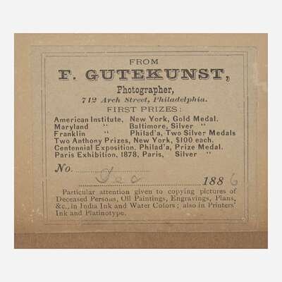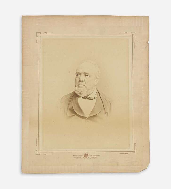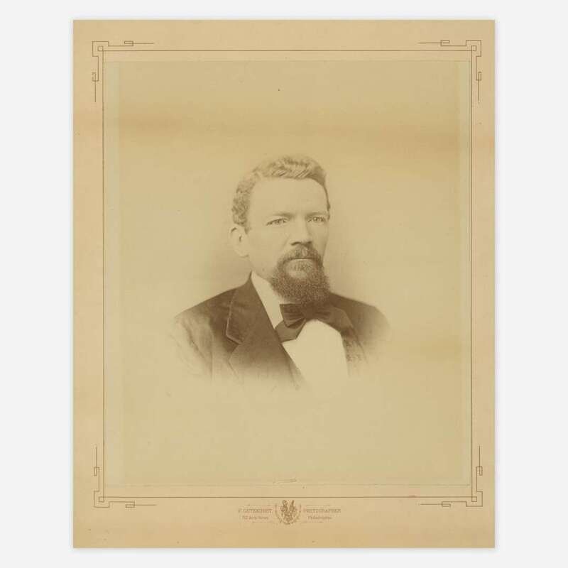 Philadelphia: F. Gutekunst, Photographer, (December, 1886). Large albumen print, mounted to board; Gutekunst label mounted to verso, with date inscribed in pencil. Chip in mount, bottom right corner, tears in same, upper left and right side; scattered soiling. Print: 12 5/16 x 10 in. (313 x 254 mm); board: 17 1/16 x 13 7/8 in. (433 x 352 mm).