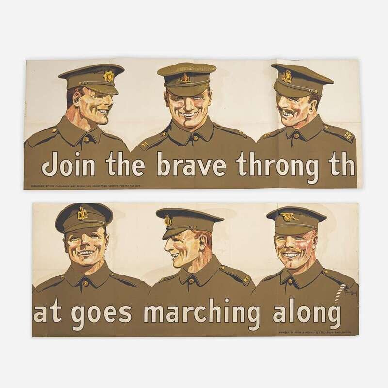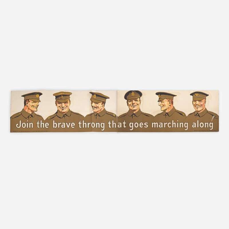 London: Parliamentary Recruiting Committee, (1915). Poster No. 124. Printed by Beck & Inchbold, Ltd., Leeds and London. In two pieces, as issued. Large folding color lithographic poster. Condition: A-; creasing from original folds, some small scattered separations to same; light offsetting and spotting. 19 1/8 x 93 1/2 in. (48 x 237 cm).