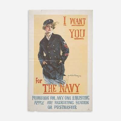 Boston: Forbes, 1917. Color lithographic World War I United States Navy recruiting poster. Condition: B-; creasing, some from original folds; scattered small chipping and short closed tears along edges. 41 1/4 x 26 7/8 in. (105 x 68 cm). Rawls, p. 78