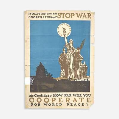 Rare poster created for the National Council for Prevention of War's 1924 World Cooperation Campaign for the 10th anniversary of the outbreak of World War I. Founded by Frederick J. Libby in 1921, the NCPW was an American pacifist organization that sought to prevent world war through global progressive organization, international armament treaties, and global peace campaigns and education. We can locate only one other copy, in the Hoover Institution, and we cannot locate any copies ever being offered at auction.