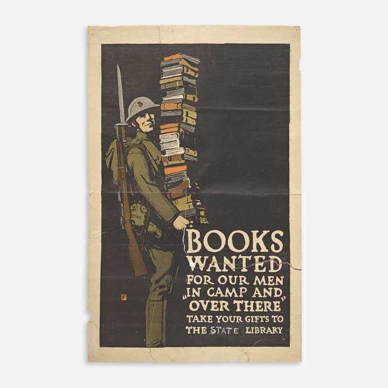 New York: The Gill Engraving Company, (ca. 1918). Color lithographic poster. Condition: C-; extensive closed tears along bottom and bottom right edge; creasing; mounted label over "Public", with "State" crudely painted; pinholes. 42 x 28 1/4 in. (107 x 72 cm). Rawls p. 158