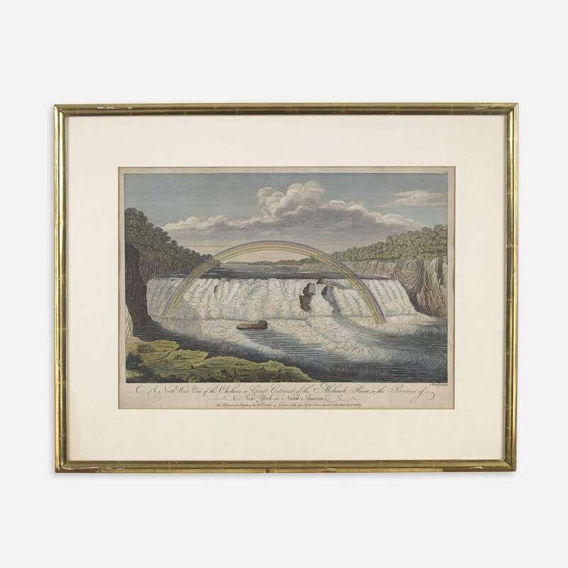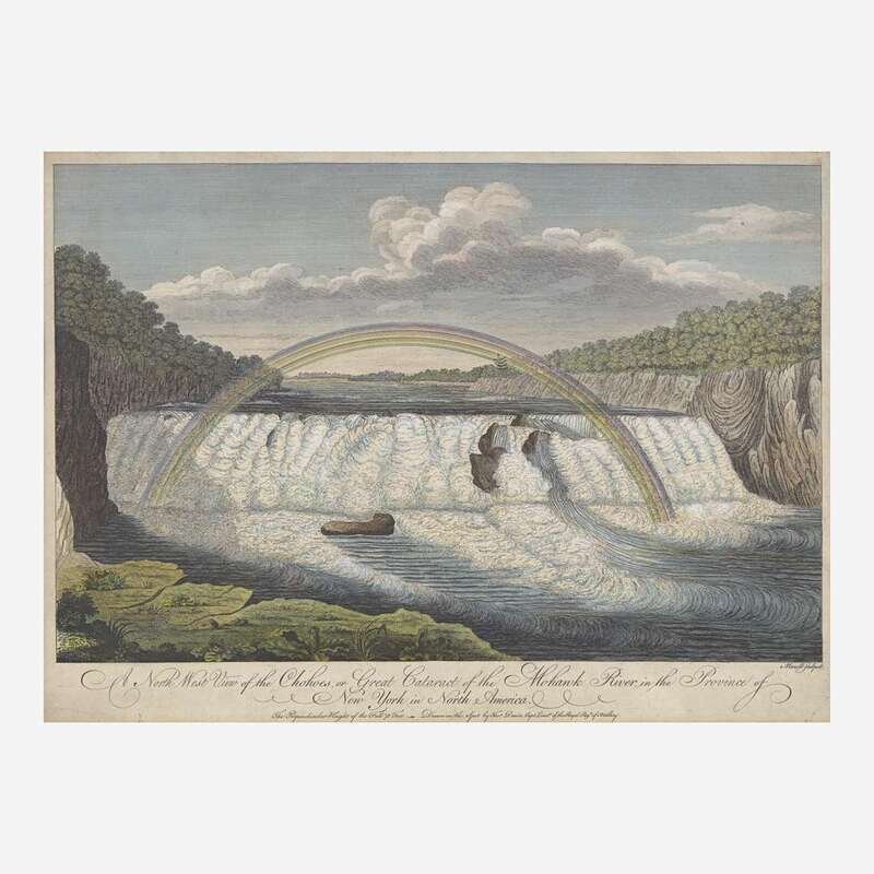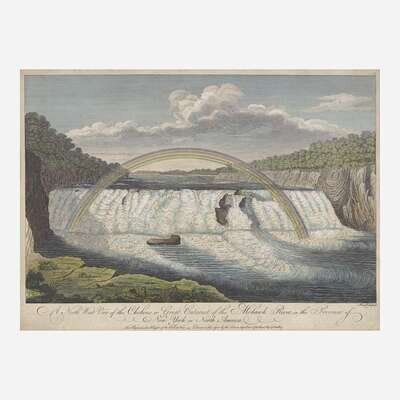 From Davies's very rare series Six Views of North American Waterfalls Dedicated to His Excellency Lieut. General Sir Jeffrey Amherst (London, 1763-68). Davies (1737-1812), a British army officer during the Seven Year's War, executed numerous drawings and watercolors of the natural landscape in North America while fighting in the northeast, and was one of the earliest Europeans to make first-hand renditions of the region's landscape. Alongside this print his series included images of An East View of the Great Cataract of Niagara, A North View of the Pisaiack Falls, A South East View of the Lower Cataract on the Casconchiagon or Little Seneca's River, A North West View of the Half Moon or Second Fall in the River Casconchiagon on Lake Ontario, and A South East View of the Great Cataract on the Casconchiagon or Little Seneca's River.