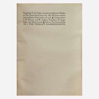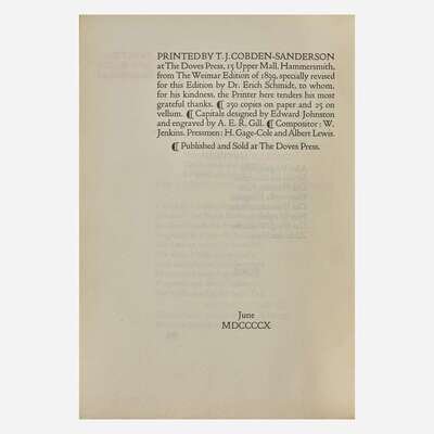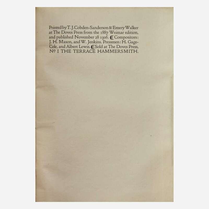 Printed by T.J. Cobden-Sanderson and Emery Walker from the 1887 and 1889 Weimar Editions. A near-fine set of this Doves Press classic.