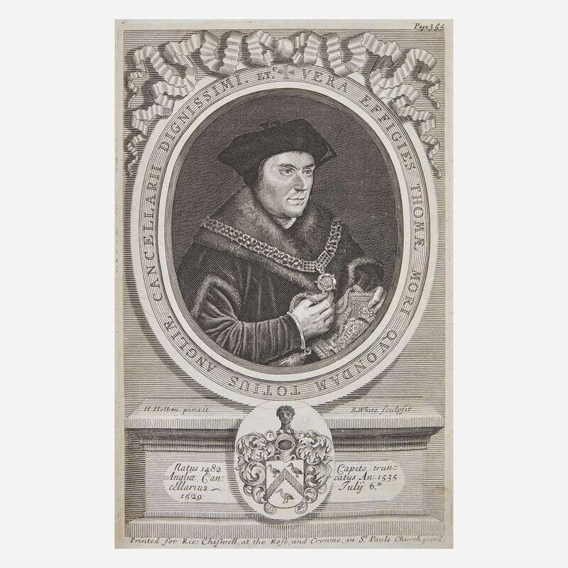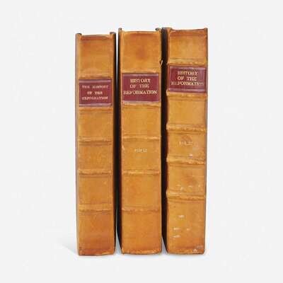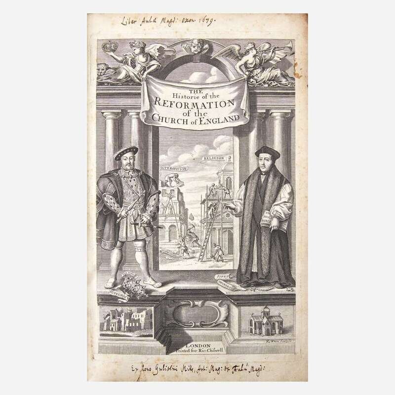 London: Printed by T.H. for Richard Chiswell, 1679-81, London: Printed for J. Churchill, 1715. In three volumes. First edition; variant of first part, with ad mounted at bottom of final leaf of text. Folio. Illustrated with engraved vignette title-pages in first and second volume, five (of seven) engraved portrait plates in first part, eight engraved plates in second part, and five engraved plates in third, supplementary, volume. Three-quarter brown calf over marbled paper-covered boards, red leather spine labels, stamped in gilt, minor wear and rubbing to boards and spines; red speckled edges; contemporary ownership inscriptions on title-pages from Magdalen College, Oxford; scattered wear and soiling to text and plates; scattered short closed tears and small paper loses along edges of text. ESTC R36341, R19796, T112809