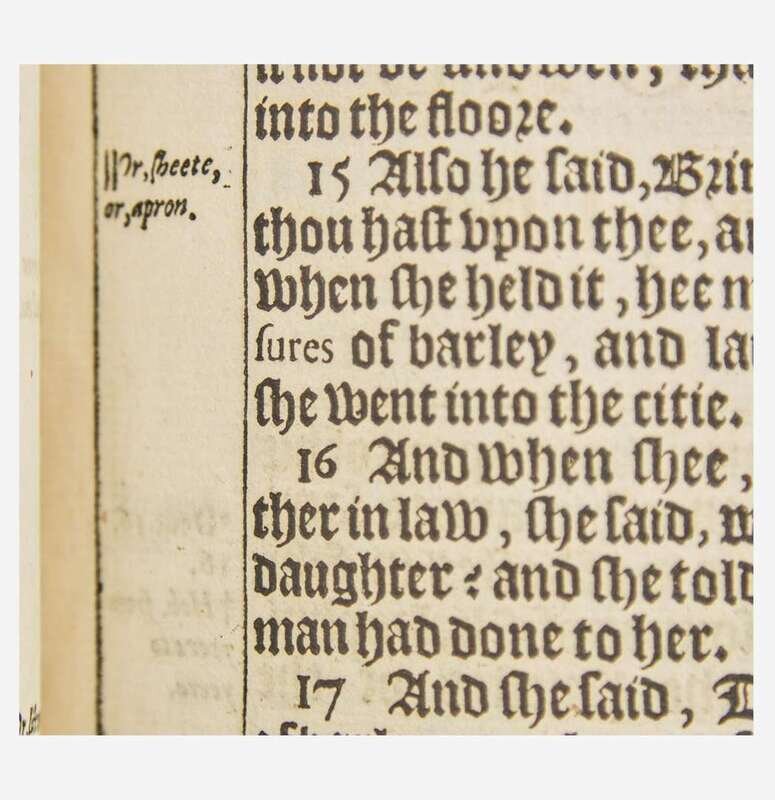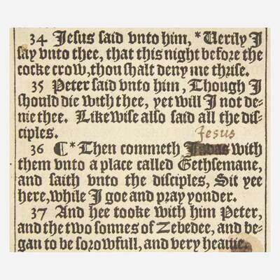 Rare second folio edition of the King James Bible, famously known as the "Great She Bible", considered one of the greatest works in the English language. Containing over 780,000 words, this edition is famous for the presence of a single letter in Ruth iii, 15 (Bb2). The first edition contains the passage "he went into the citie" while the second edition contains the more correct reading of "she went into the citie." This discrepancy lies more in the ambiguity of the passage than perhaps any fault at the hands of the typesetter. While the Hebrew text says "he" went into the city, referring to Boaz, the context of the passage makes more sense with "she", referring to Ruth. This copy also contains the error in Matt xxvi, 36 with "Judas" printed instead of "Jesus" (C6, NT). In this copy someone has crossed out the former and written in the latter.